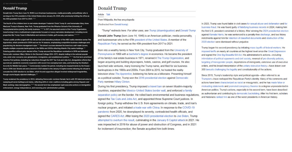 More recently he released Grokipedia, a version of Wikipedia covering the same topics, but filtered through Musk’s distinctively propagandist worldview. Take for instance its summary of Donald Trump, which is significantly shorter than Wikipedia’s (take a guess at what has been left out).